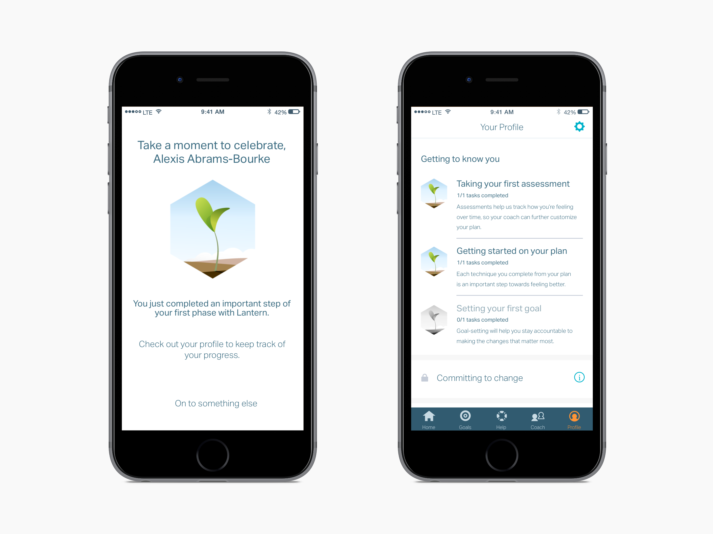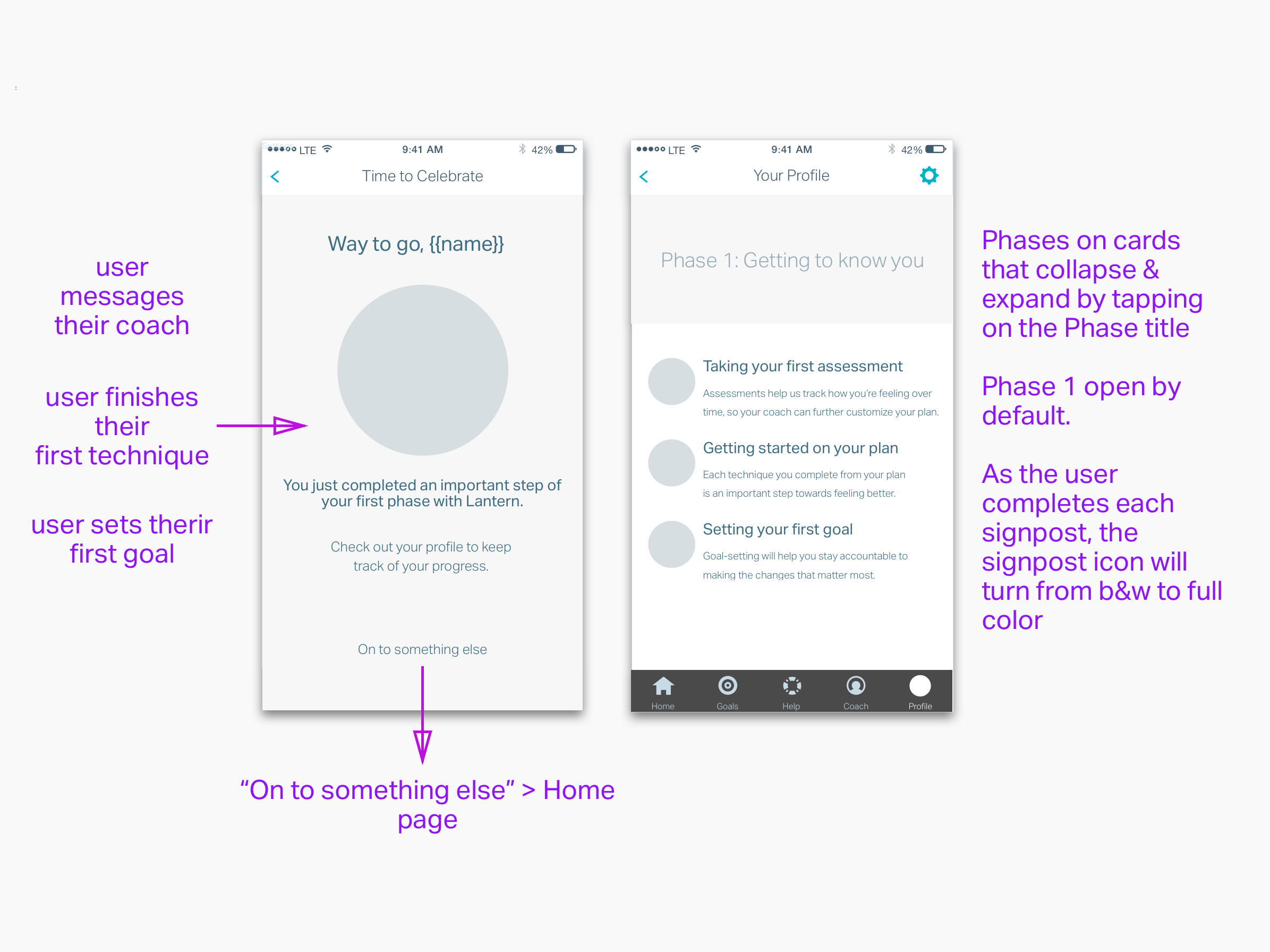 Additionally, we wanted the UX to help clarify for users how Lantern could help them improve their mental health and life. With the clinical innovations team, I developed five phases to represent a user's emotional and behavioral evolution: