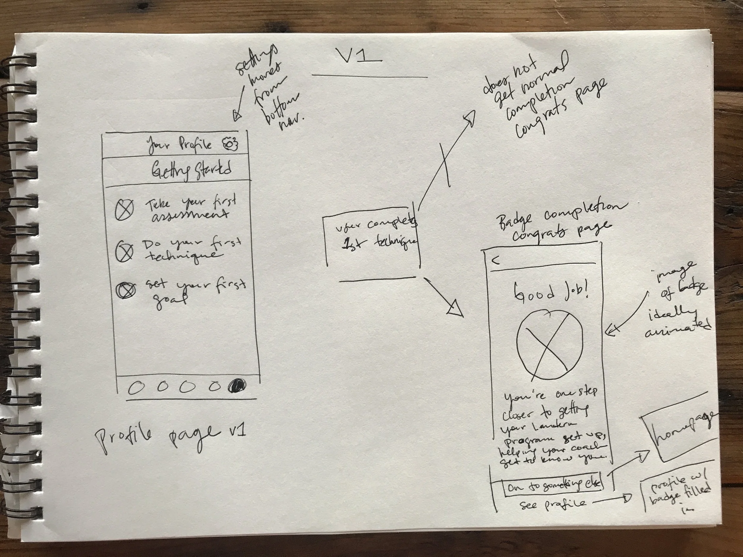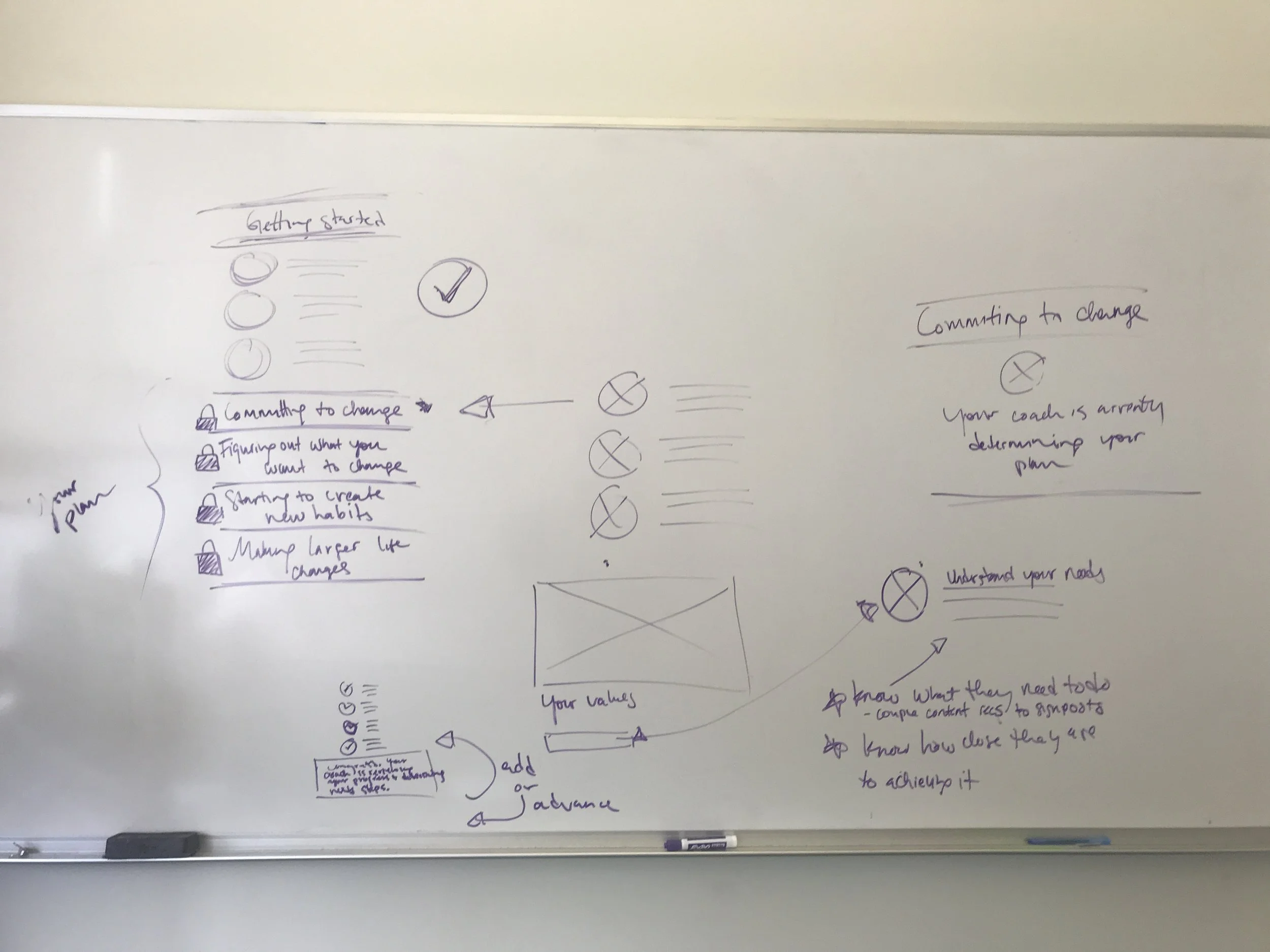 I sketched with our clinical innovations team to think through both the v1 and v2 of progress. We decided to keep v1 simple–we were looking for a project that would require no more than one week of engineering time. V1 was more focused on user onboarding–solving the new user drop-off issue.