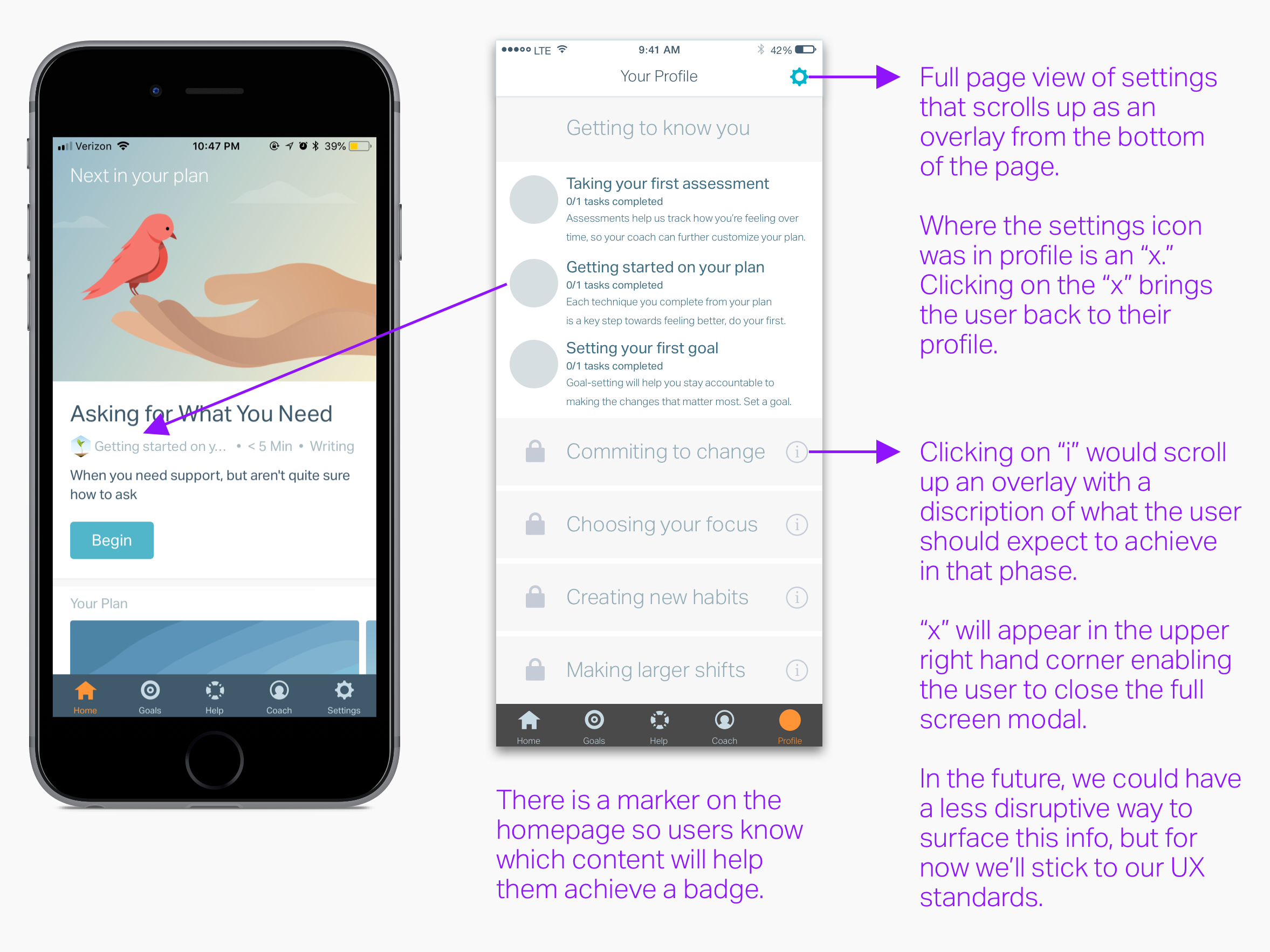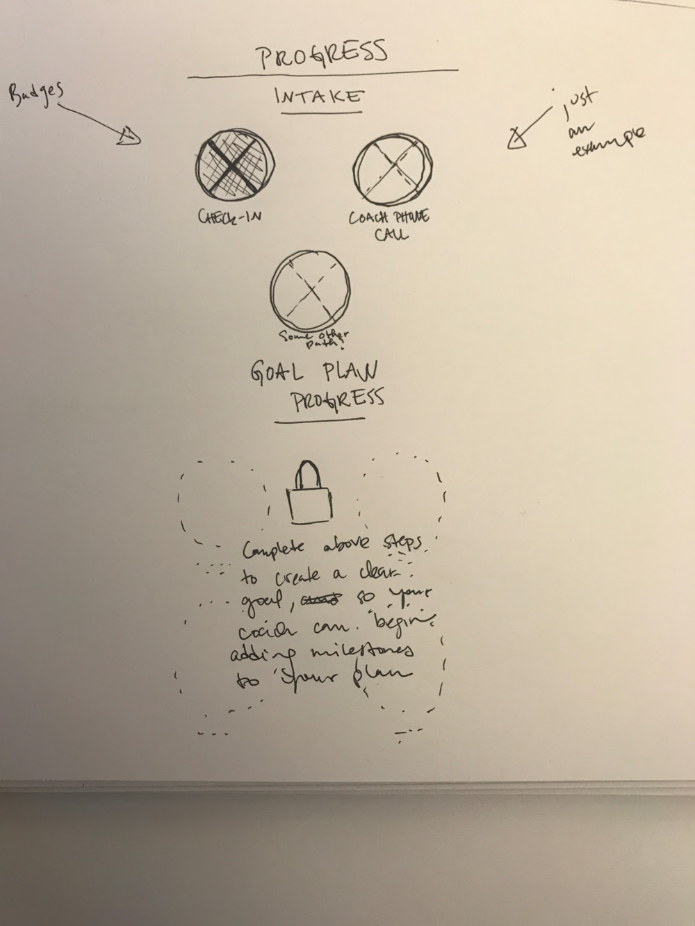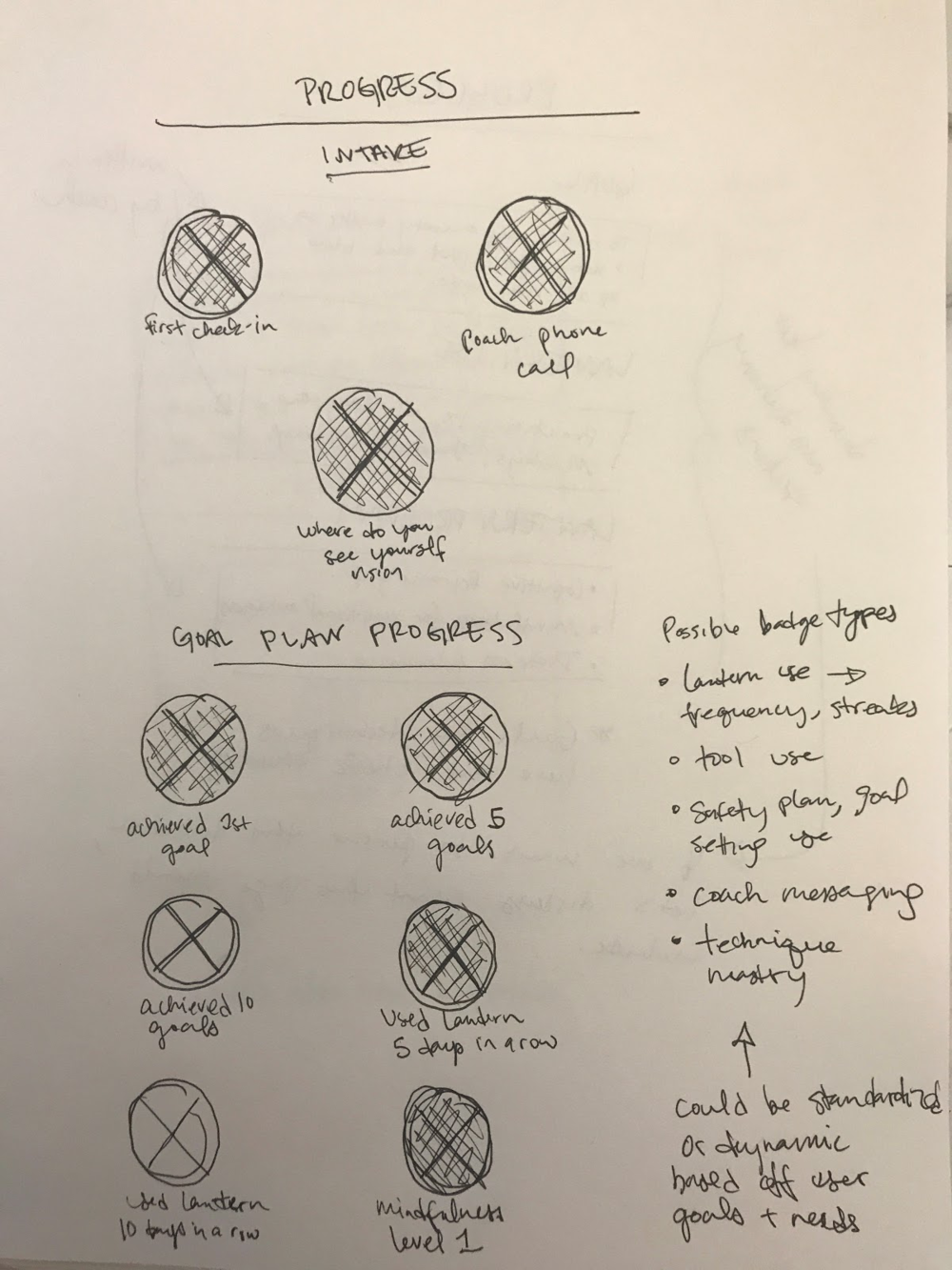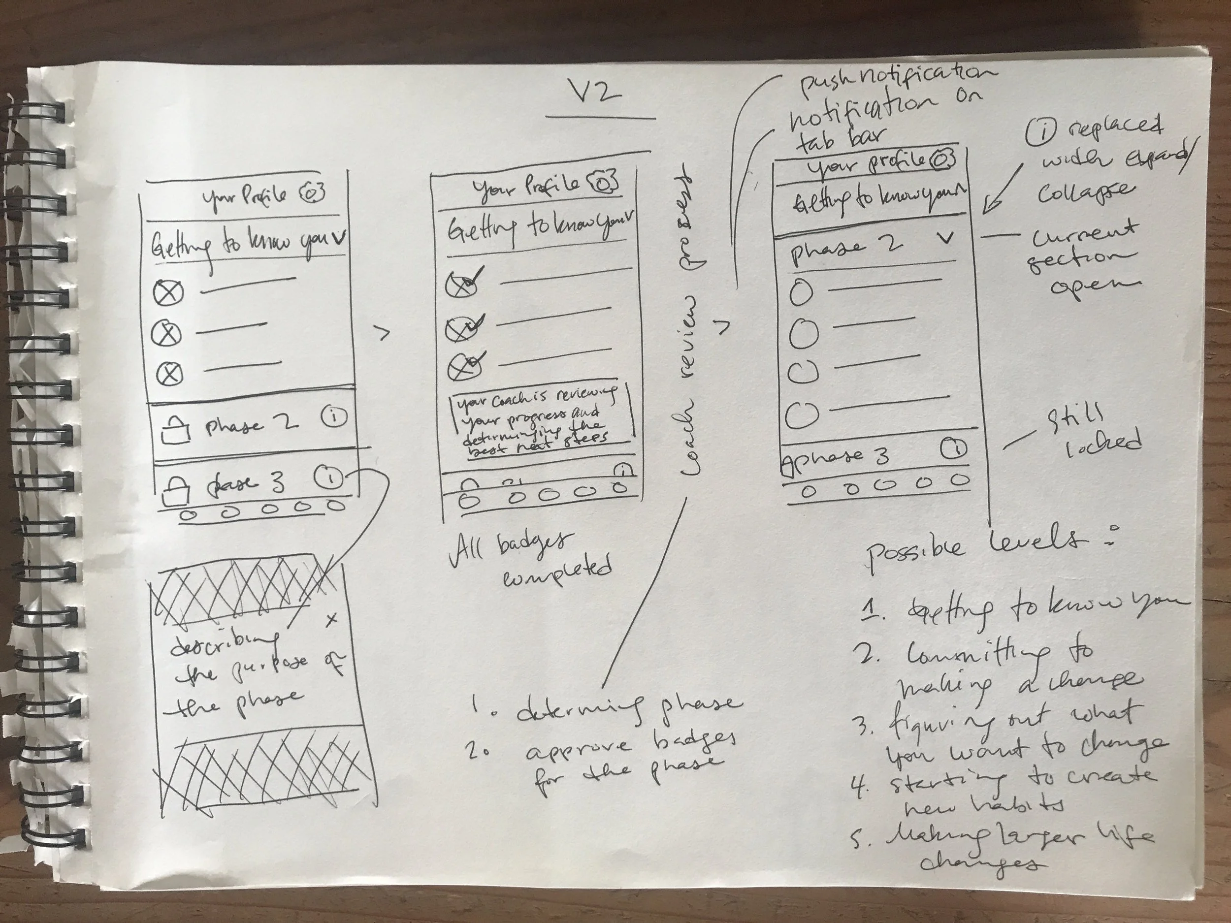 I imagined the badges in each phase as personalized for each user by their coach. This concept is aligned with clinical best practice–while the phases of behavior change are the same across individuals, the actual steps needed to move through each phase varies by person.