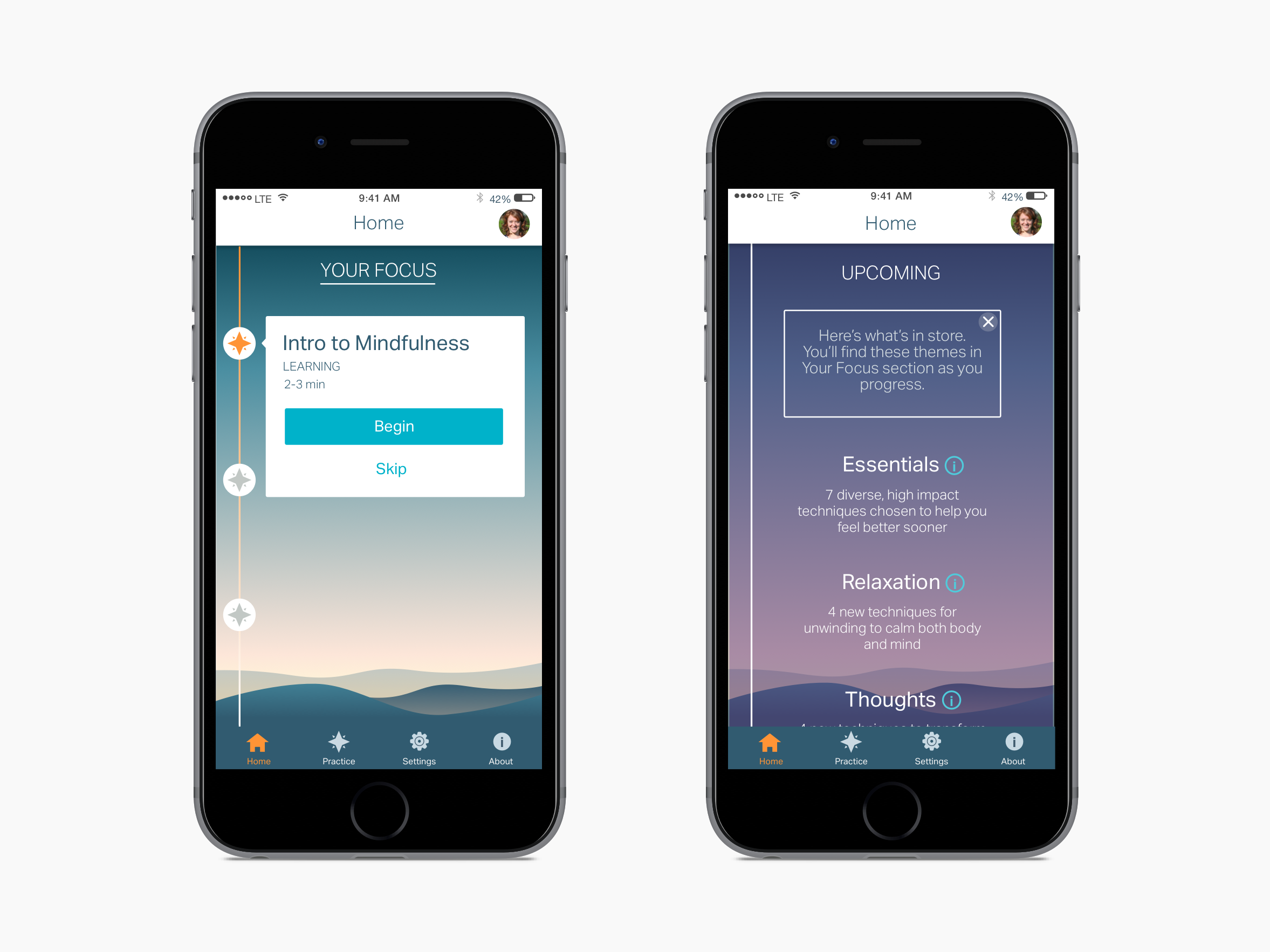 We decided to nest the progress page within a new profile tab bar item. This enabled us to add settings to the page. In the future, we were hoping to add other metrics, e.g. the user's GAD7 (a standardized measure for Generalized Anxiety Disorder) scores, to this tab.