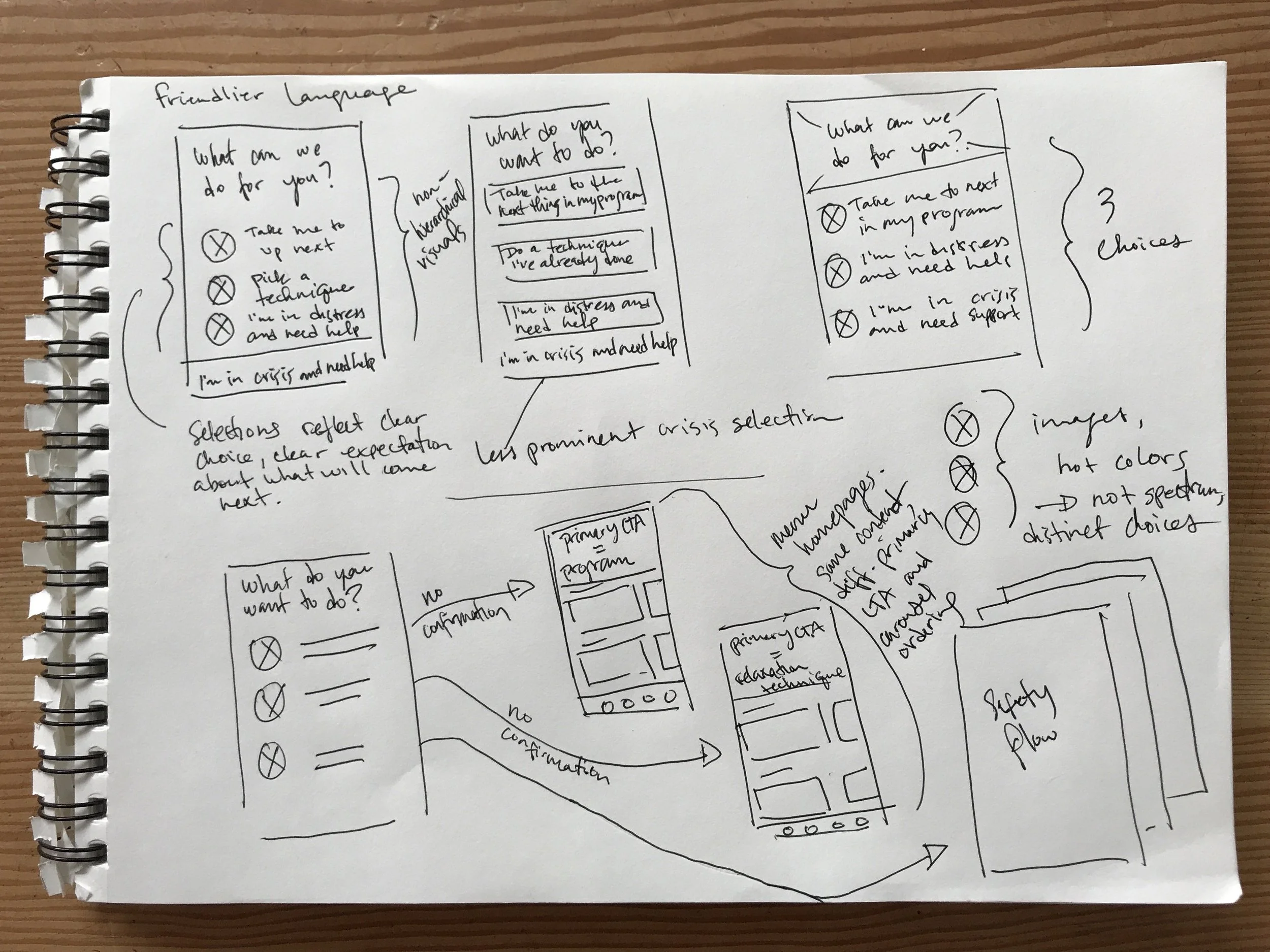 Our content writer, clinical expert, visual designer, and I sketched together different ways to enact these scenarios.