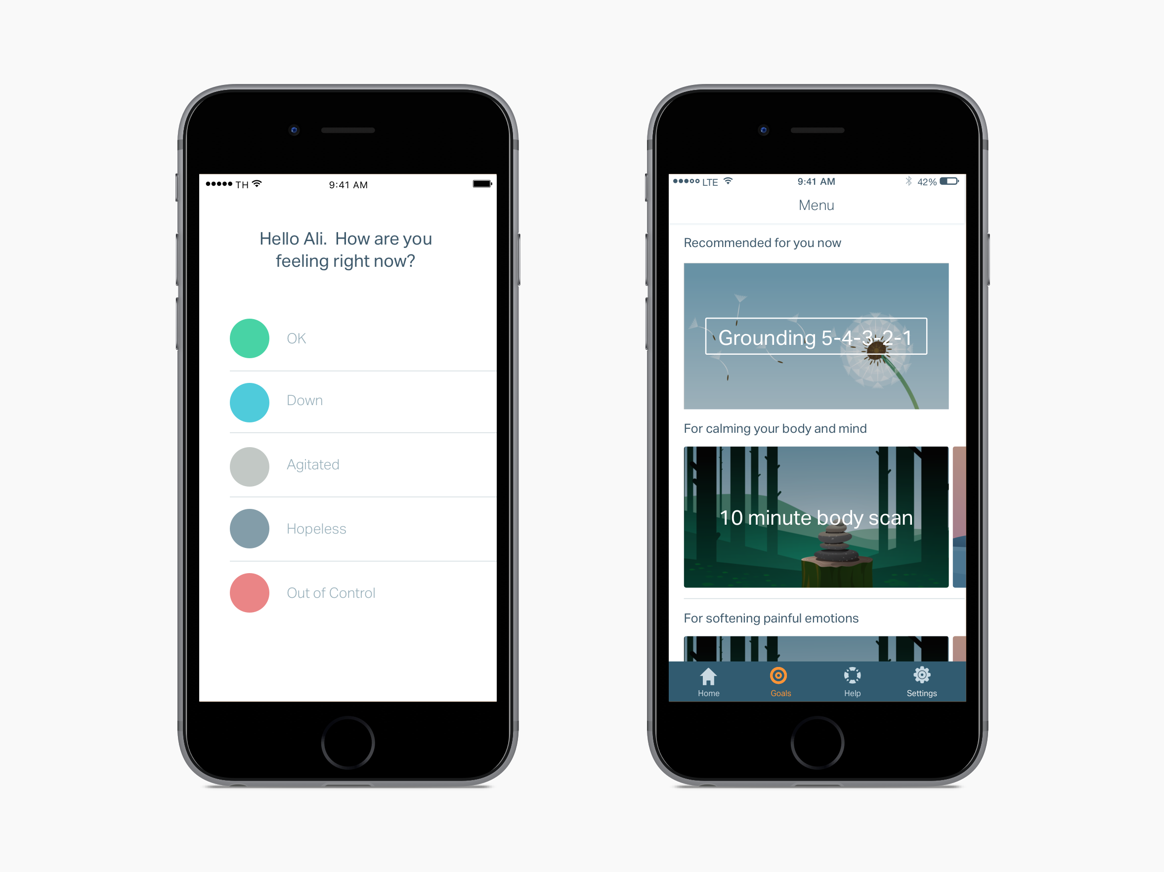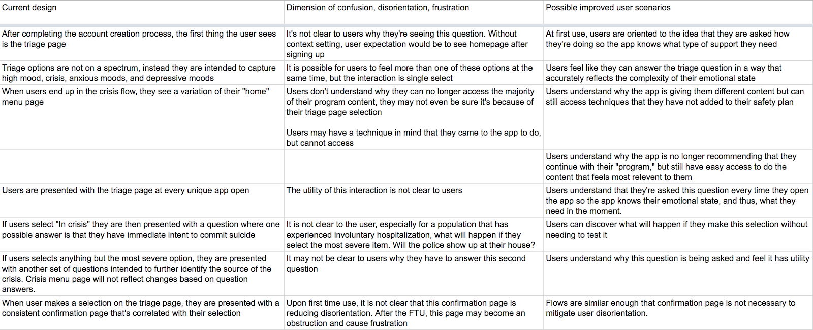 Initially I did usability testing of v1 on a non-clinical population. The test yielded results that showed high comprehension of the design. However, people in emotional distress react and interact with features differently than people under low or no stress. Additionally, longitudinal studies often reveal more qualitative issues that only emerge upon repeat usage.
