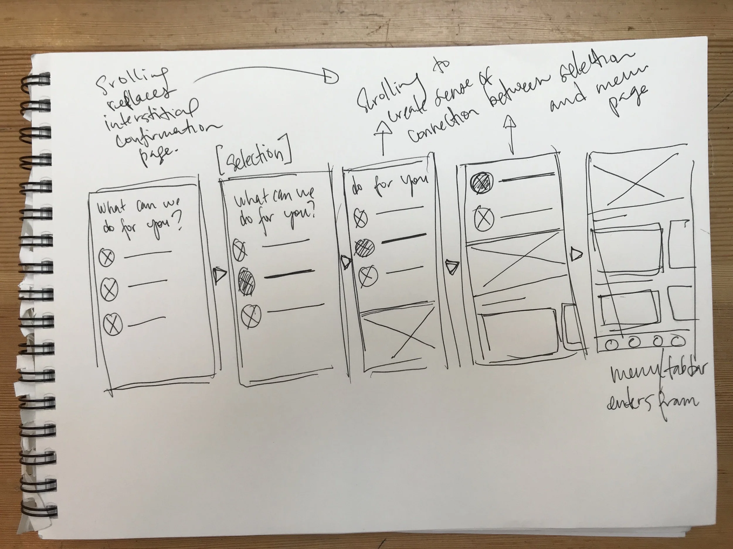 Sketches experimenting with friendlier, more direct language, non-hierarchical selection, and a shorter flow